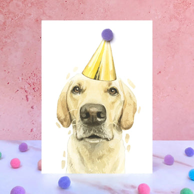 With an adorable little nose you could reach out and kiss, here's Penny the yellow Lab. Brighten someone's day with this beautiful high-quality card produced from my original painting of Penny the black Labrador Retriever, featuring a 12mm pompom which adorns her party hat! This greeting card is perfect for any dog lover's birthday, or any occasion that warrants a celebration! The cards come individually wrapped in cellophane and are printed on premium quality, FSC-certified 350gsm thick card, featuring a high quality print of an original watercolor painting by the artist Robert James Hull, hand embellished with a beautiful and modern coloured pom pom.